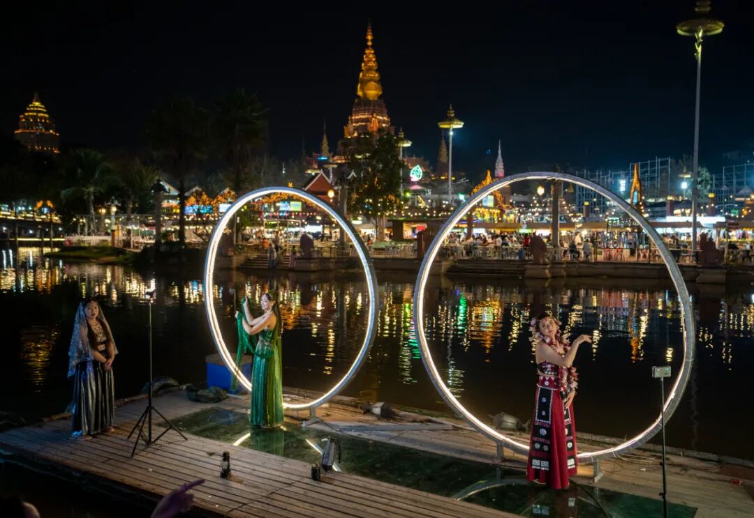 (游客在景洪市告庄西双景星光夜市旅拍 新华社记者 陈欣波 摄)