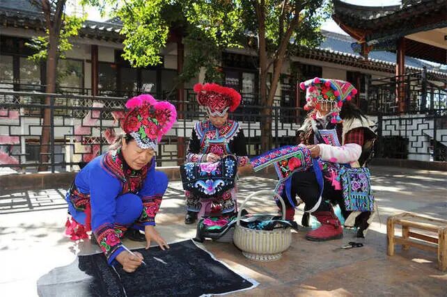 在永仁县永定老街非遗集市,绣娘们用心观察花草的千姿百态,以高超的技艺飞针走线,将夏花的绚烂印刻在黑、蓝的布上,缝进衣袖口、衣襟、手肘、裤筒、膝盖、帽子……穿花纳锦,传达对生活的热爱和对大自然的歌颂。
