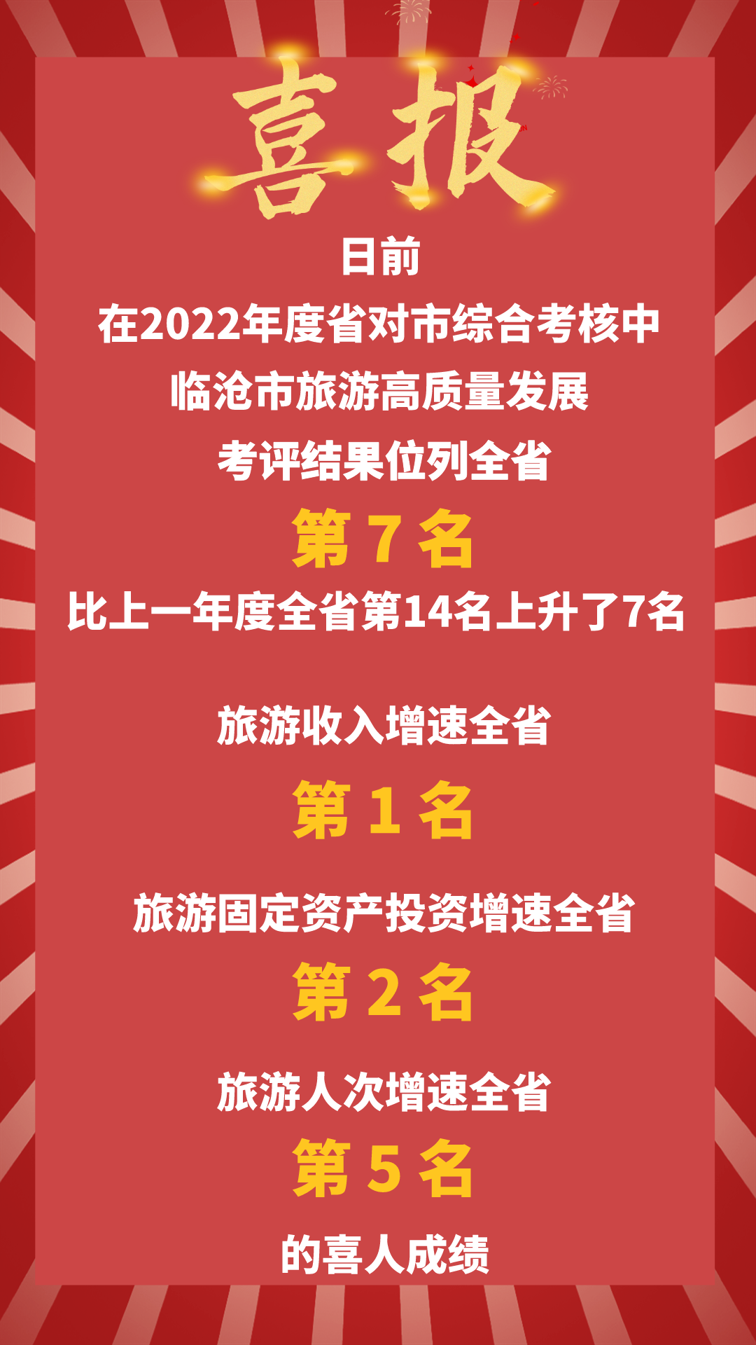 全省旅游高质量发展的综合考核,是省级考评范围最广、细则最多的综合性考核,主要包含旅游主要经济指标、文旅项目固定资产投资、旅游品牌创建、文旅市场主体倍增、智慧旅游和文旅市场检查情况六个方面。去年,在云南省文化和旅游厅的关心支持下,临沧市文化和旅游局学习宣传贯彻党的二十大精神和习近平总书记关于文化旅游工作重要指示批示精神,坚持国际化、高端化、特色化、智慧化发展方向,对标全省旅游高质量发展考评指标,树立争先进位意识,推进作风革命、效能革命,通过全市文旅行业的共同努力,交出了“十四五”全面实施之年喜人的成绩单。