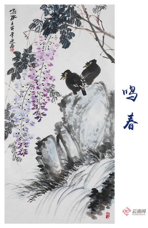我在迤君处观画,见到其画的丝瓜线条、轮廓、着色极似近故大理著名画家谢长辛,便问之。迤君云:其早年入中国书画函授大学大理分校国画系学习,以谢长辛为师。后又看迤君兄画的“群鸭戏水”似任伯年,他画的“八哥”似李苦禅,便知他追溯至清朝及近代,下足临摹功夫。观其近几年的画作,则在吴昌硕、齐白石一路苦修,将白石老人那种对比强烈的色彩融入自己质朴的画风中,增加其明快之色。白石老人用极工细的草虫配大写意花卉,或用重彩与泼墨相结合,使画风顿显热烈,更具人间烟火气,却在“俗”中现“雅”,是齐白石的厉害之处,迤君仿之,亦已做到大俗大雅。白石老人具有生活气息的朴实清新之风,迤君也能仿效,篮中的枇杷、石头上的八哥、芭蕉叶下的小鸡,都显现出浓郁的生活气息。相对而言,身为海上画派重要画家的吴昌硕,其画风更显高古朴雅,能以俗入雅,其以书法入画,金石气十足,其画墨梅,纯以篆法入笔,显得高古苍劲。其画的紫藤、葡萄,以草书入笔,笔势雄健纵放、紫藤错综交叉,静动、虚实、繁简、刚柔结合,显得纵逸恣肆而又生机勃发。吴昌硕之画,既有文人之雅,又有平民之俗,他经常画梅、兰、竹、菊、水仙等寻常物事,迤君亦深受吴昌硕影响,擅画紫藤,深得老缶(吴昌硕)之意,擅画竹菊,亦深得隐逸之真趣。