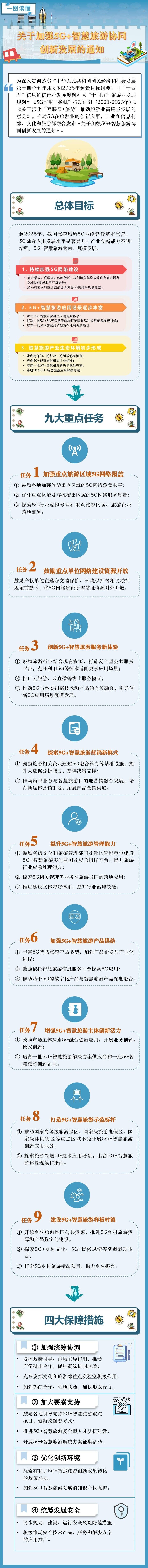 一图读懂《关于加强5G+智慧旅游协同创新发展的通知》 2023-04-12 09:28 中国旅游报 0 近日,工业和信息化部、文化和旅游部联合发布《关于加强5G+智慧旅游协同创新发展的通知》。通知说了哪些内容?一图为你“划重点”。 来源 中国旅游报 责编 童文文 审核 华芳