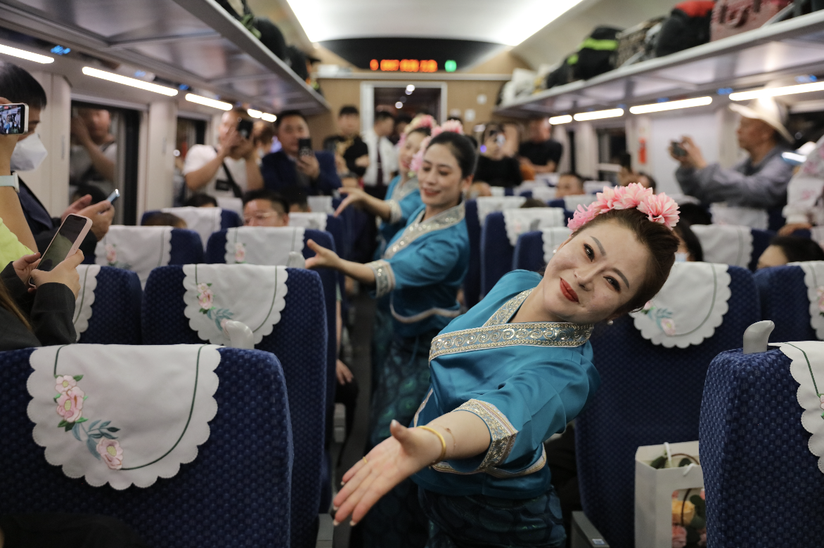 在旅途中,还举办了多场文艺演出,包括傣族舞蹈、葫芦丝演奏、歌曲演唱、老挝传统舞蹈等,吸引了大量游客参与互动,将车厢氛围推向了高潮。