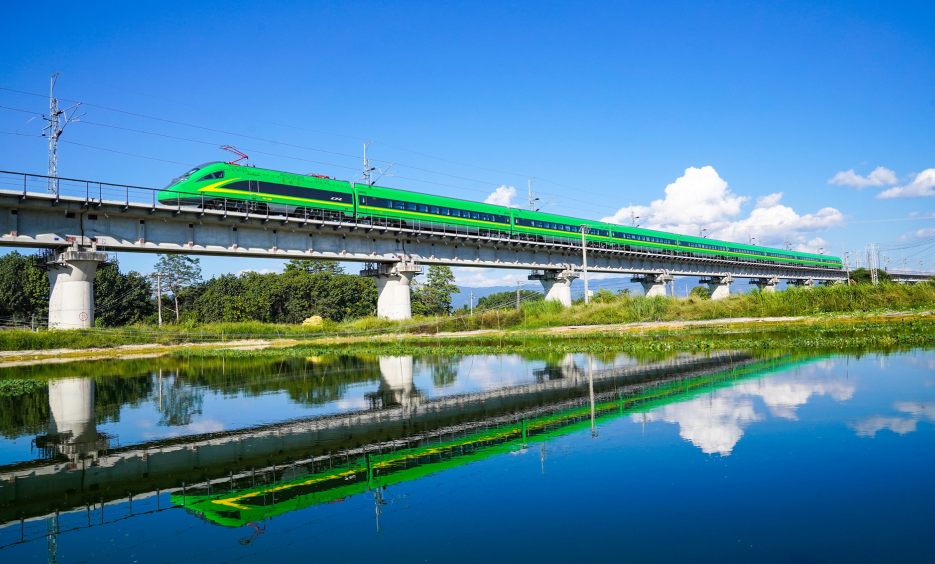 (资料图 复兴号动车组飞驰在中老铁路橄榄坝特大桥上 杨林 摄)