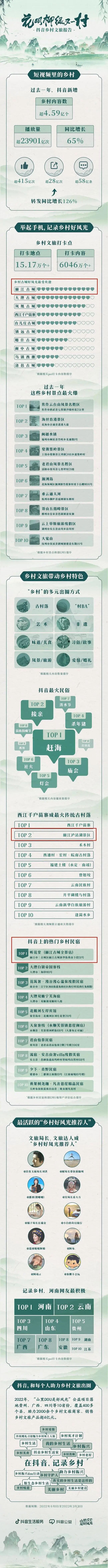 过去一年,抖音网友打卡了多少次乡村景点?哪里的乡村风光最受抖音网友的喜爱?什么省份的网友最喜爱记录乡村美景?4月17日,抖音生活服务《乡村文旅数据报告》正式发布。其中,丽江古城获抖音网友最喜爱的“乡村古城好风光”第一名;丽江泸沽湖景区获“抖音最火传统古村落第二名;听花堂(丽江古城全景店——丽江古城新华街黄山下段51号)获抖音热门乡村民宿第一名。