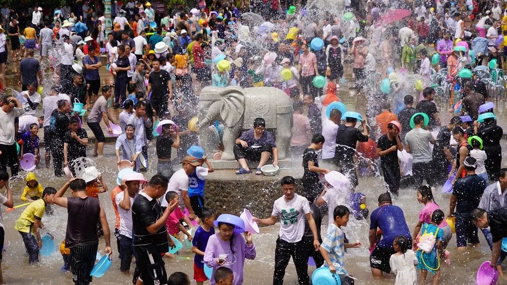 每年的傣历新年是永兴傣族乡隆重的节日盛会,在这一天,勤劳勇敢、淳朴善良的傣家儿女用传统的泼水方式来庆贺一年的丰收,祈愿来年的风调雨顺,也将美好的祝福带给每一个人。作为泼水节的重头戏,泼水狂欢在泼水广场激情上演。象征着吉祥、幸福、健康的水花在空中飞舞盛开,大家尽情地泼洒,飞舞的水花和欢呼声、呐喊声交织在一起,响彻云霄,“泼湿一身,幸福一生”的美好寓意在游客中蔓延,热闹非凡。