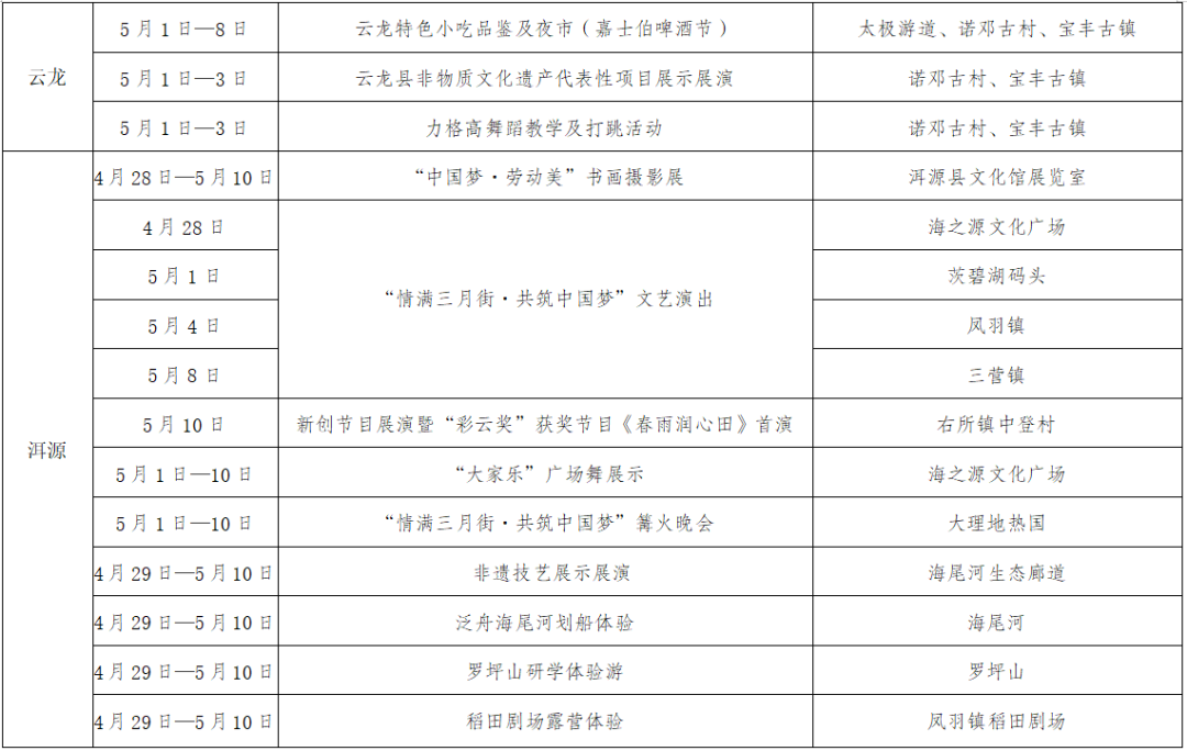“五一”劳动节(5月1日)、三月街民族节(5月4日—6日),按照《关于大理州部分旅游景区设立州内公民免费开放日的公告》,崇圣寺三塔文化旅游区、蝴蝶泉公园景区、天龙八部影视城景区、巍山巍宝山、剑川石宝山景区、宾川鸡足山景区、水目山景区,大理州内公民凭本人有效身份证即可免费进入游览(景区内索道、电瓶车、游船等项目不属免费范围)。