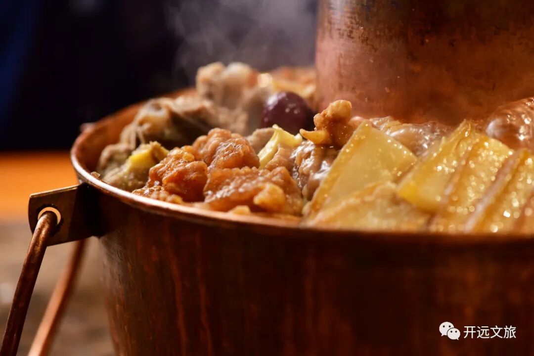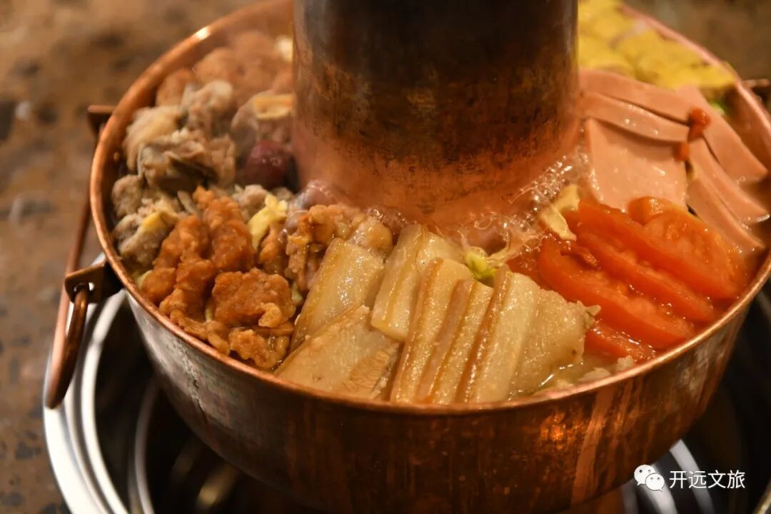 红河炊锅声名远播,开远炊锅也极负盛名。一口铜锅,将土豆、青笋、藕片、豌豆、番茄、豆腐皮、酥肉、腊肉、排骨等众多美食汇聚一起,在炭火的慢慢加热下,散发出最诱人的香味。