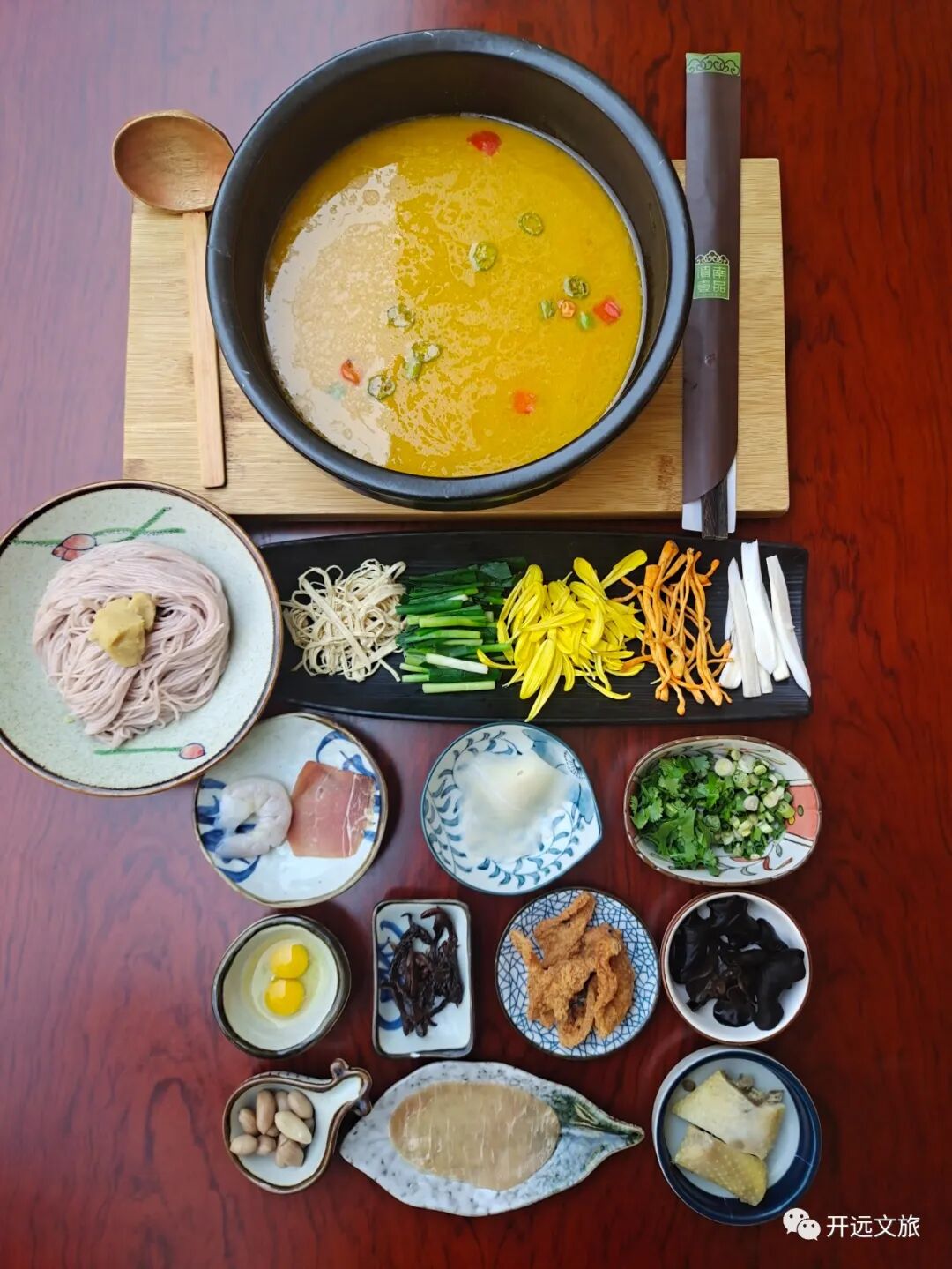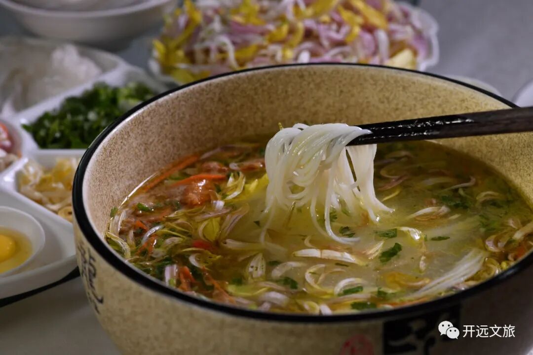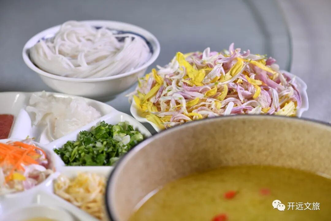 菊花米线已经成了开远的一个符号,也是身处异乡开远人的一份情结。菊花米线的精髓,在于菊花。菊花清甜微苦,具有清热的功效,配以用鸡、鸭、大骨等熬制的高汤,是为“天作之合”,再辅以鹌鹑蛋、肉片、豌豆坨、菊花、鸡肉块等配料依次倒入汤中,最后放米线,稍作搅拌,香气四溢。一碗菊花米线,开启一天好心情。