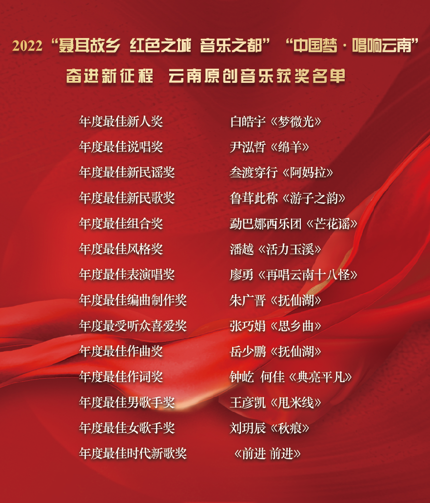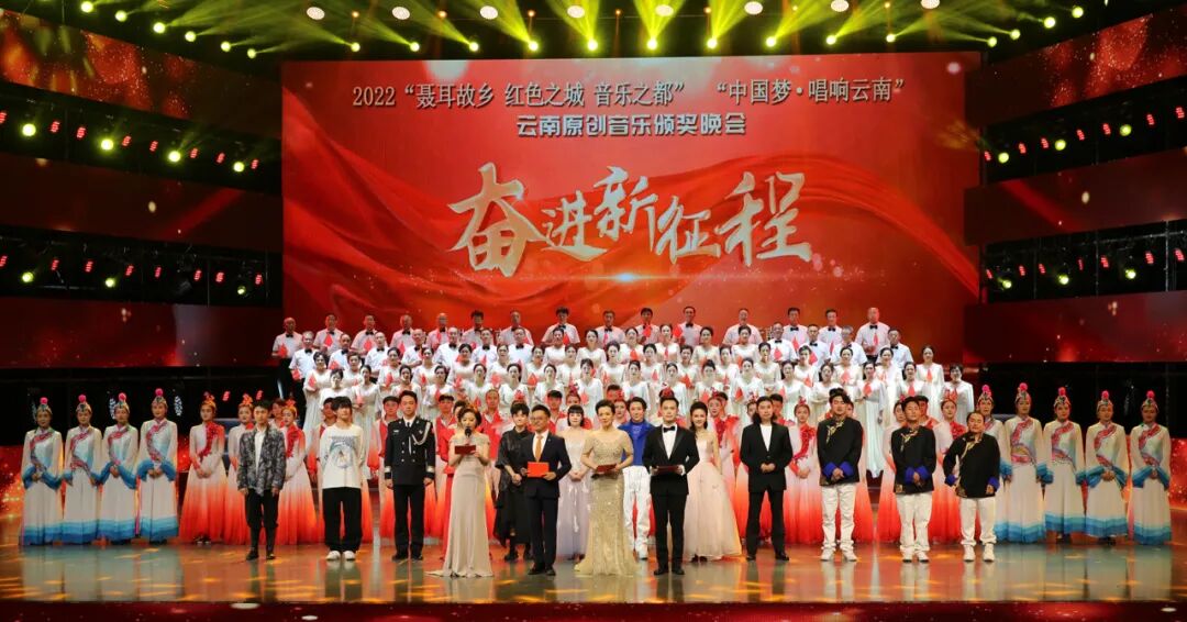 奋进新征程,用音乐叩响使命。4月25日晚,由中共玉溪市委、玉溪市人民政府、云南广播电视台主办,中共玉溪市委宣传部、云南广播电视台音乐频率、玉溪市文化和旅游局、玉溪广播电视台、云南聂耳音乐基金会承办,玉溪市文化管理服务中心协办的2022“聂耳故乡 红色之城 音乐之都”“中国梦·唱响云南”云南原创音乐颁奖晚会在玉溪聂耳大剧院举行。