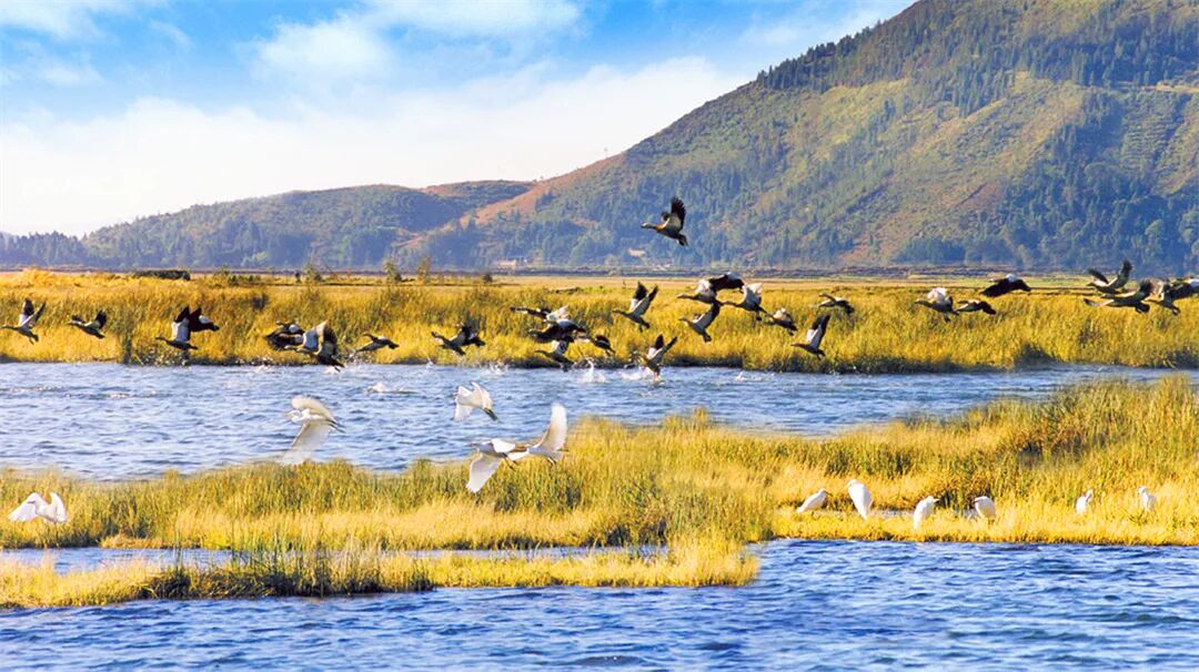 得天独厚的地理条件,还造就了青华海独特的湿地景观,呈现水域、地貌、植物、动物、天象等景观资源。青华海属怒江水系,地处横断山区,是全球生物多样性关键地区和我国鸟类迁徙重要通道,也是三江并流世界自然遗产的重要组成部分。青华海历史悠久、文化底蕴厚重,是保山哀牢文化发源地。