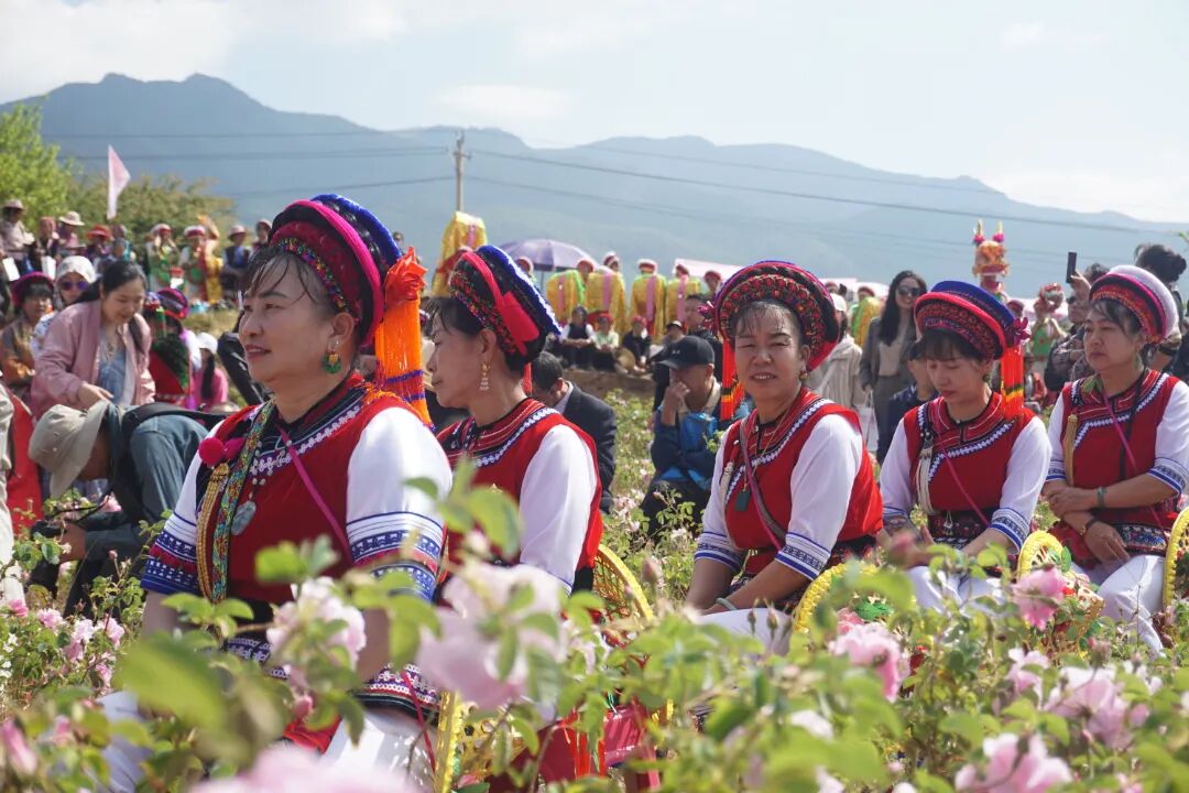 在基地内,大理首届大马士革玫瑰摘花节正在举办。开幕当天,现场不仅有玫瑰花茶艺表演,还设有玫瑰精油、玫瑰纯露、玫瑰醋、玫瑰酒等一系列玫瑰产品展示区,《弦子送到你门前》等歌曲也响彻玫瑰飘香的山海之间,吸引了众多游客围观、体验。