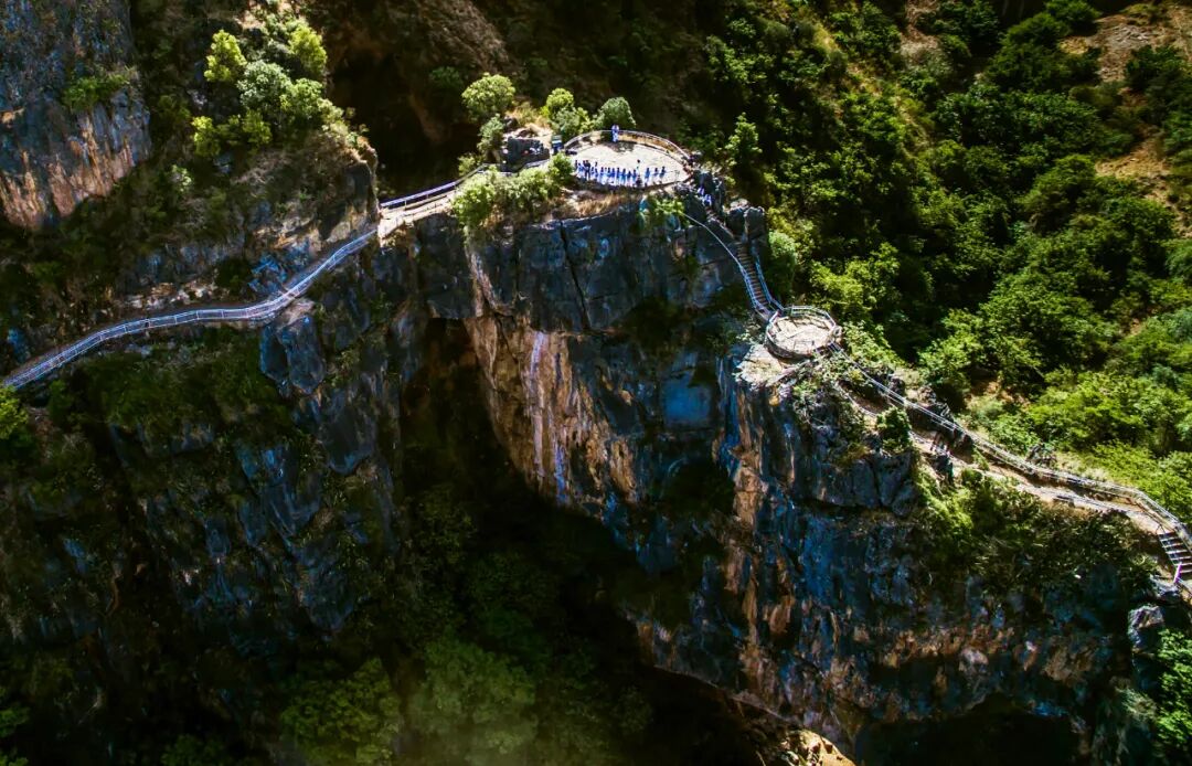 小河淌水·天生桥景区:天生桥景区位于弥城东约4公里的群山中,是滇西著名的旅游胜地,有“天下无双境,人间第一桥”的美誉。景区属典型的喀斯特地貌,溶洞、奇石形态万千。天生桥东西峙壁屹立,两壁如刚,巍峨高耸,壮如城垣,一巨崖飞架东西石壁,天成石桥,故名天生桥。全长62.4米,桥面宽8.2米,桥身通高56米,东西石壁林木繁茂,殿阁楼宇星罗棋布,气势宏伟壮观。