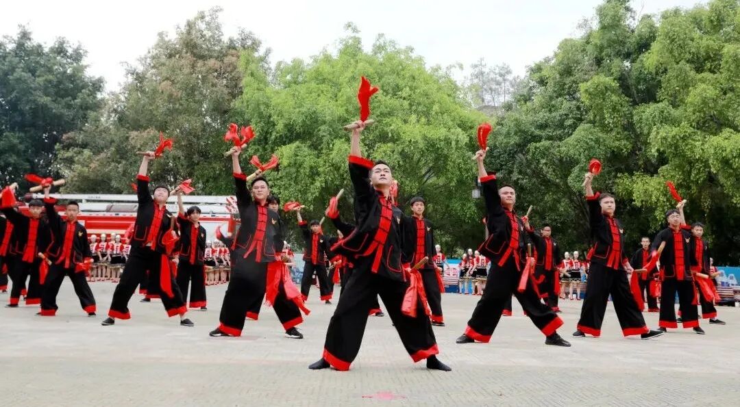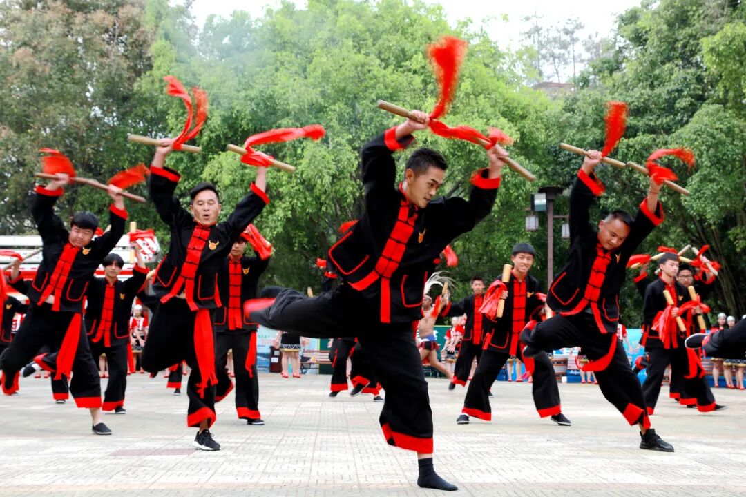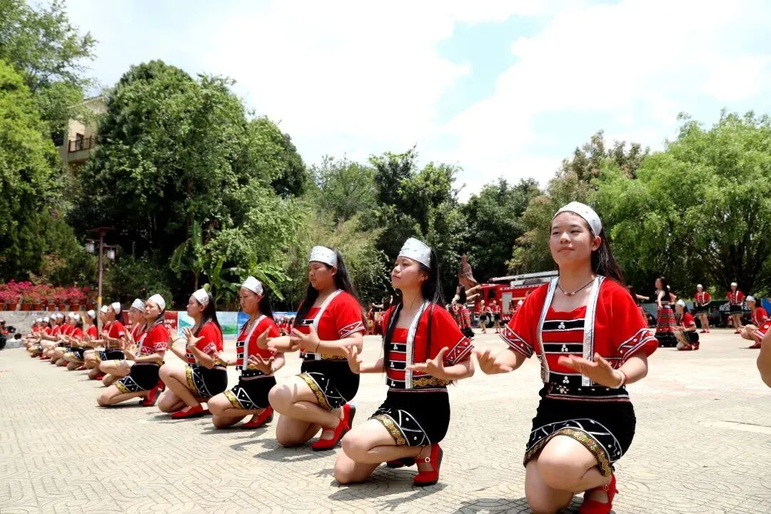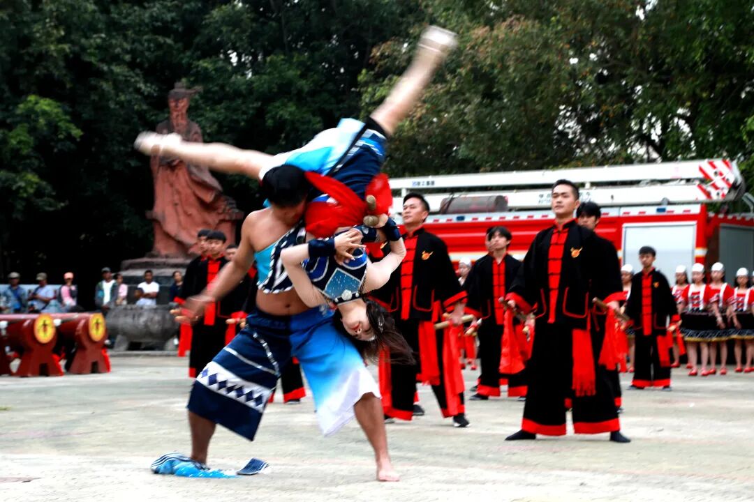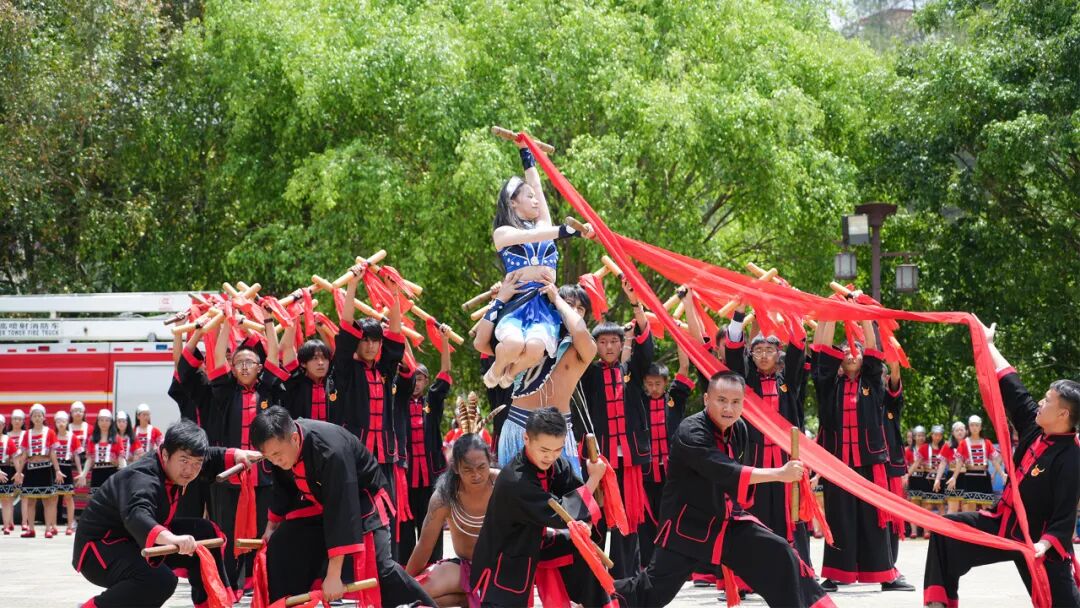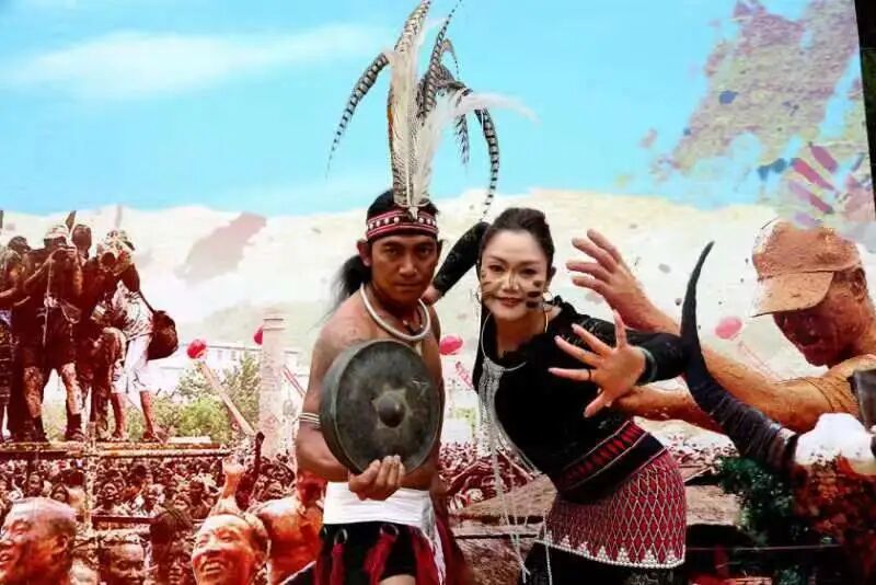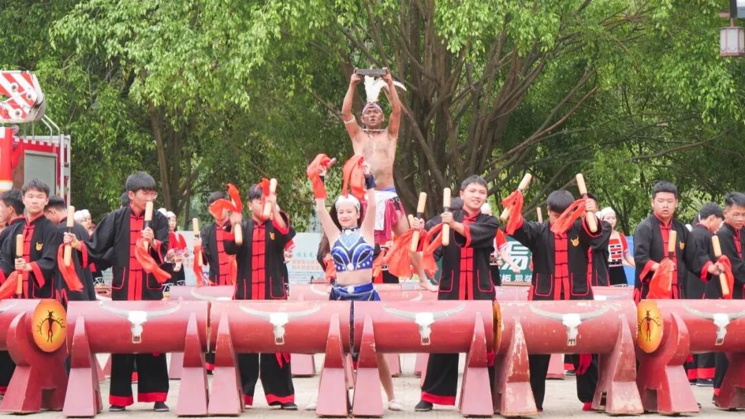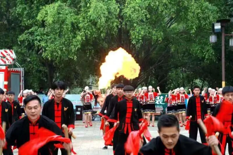 活动现场,数百名演员一起有律动地跳起《木鼓舞》,欢迎参加活动的远方游客和市民朋友。木鼓,被佤族人视为通天神器,常用于佤族重大祭祀庆典等重大活动中,源远流长的佤族木鼓舞也因此第一批国家非物质文化遗产。身材健硕的佤族小伙站在粗壮的木鼓上,从口中一次次喷出耀眼的火焰,现场顿时火光冲天,气氛热烈,那是阿佤人民对美好生活的赞歌。