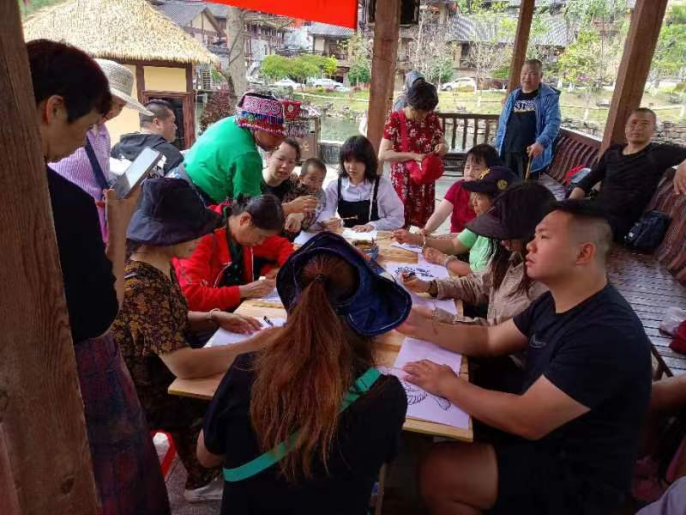 在滴水苗城的苗历广场,许多游客围着苗族妇女学习屏边苗族富有特色的民间印染工艺——蜡染,屏边苗族的蜡染主要是做褶裙所需。这项非物质文化遗产让游客们感到十分新奇,纷纷拿起笔体验画蜡,自己创造出一件美丽的工艺品。苗族服装鲜艳精美,图案丰富,不少人还穿上苗族服装感受了一回当“苗家姑娘”的乐趣,沉浸式打卡滴水苗城。