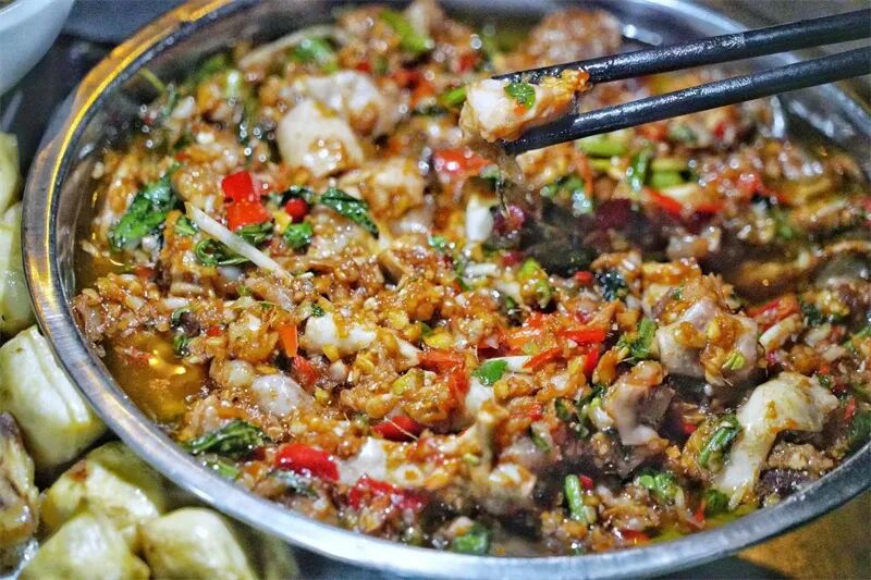 建水烧烤,就更离不开那碟蘸水了。作为建水烧烤的灵魂,蘸水分“干”和“湿”两种。干料主要由辣椒面、精盐花椒面组成,最有名的当属云南人的心头爱“单山蘸水”。湿蘸水一般用卤腐汁、辣椒粉、花椒面、蒜油调制,加入新鲜的红色小米辣碎粒、折耳根,香辣浓郁。
