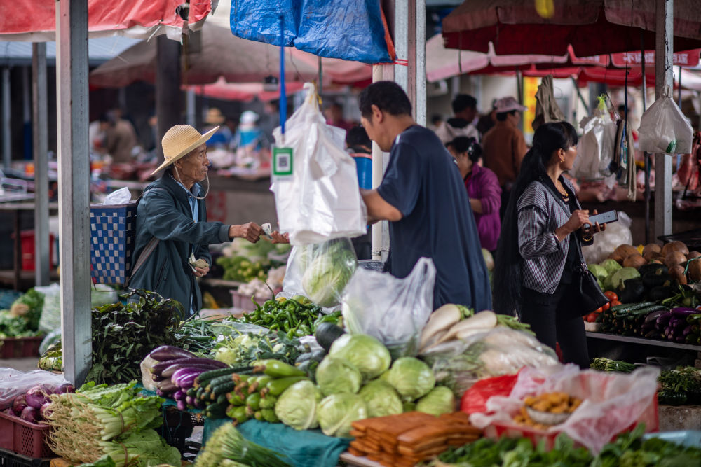 5月3日,村民在云南省保山市隆阳区瓦窑镇集贸市场购买新鲜蔬菜。新华社记者 江文耀 摄