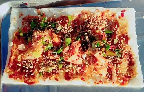 新鲜现做的饵块,只需要在炭火上烤几分钟,就会像吹气球一样鼓起来,柔软蓬松,抹上店家自制的饵块酱,可甜可咸,软糯的烧饵块包裹着烤得外皮酥脆、内里柔韧的油条,口感香气四溢、软糯酥脆。饵块还可搭配火腿肠、鸡柳、煎鸡蛋等食材,让饵块的口感层次更丰富。