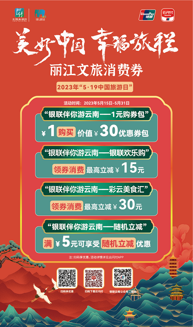 5月19日、20日两天,还将在丽江古城玉河广场开展“中华民族一家亲·同心共圆中国梦”民族歌舞展演、综合文化艺术体验、非遗美食节、文创产品展售、现场直播等活动,同时携手中国银联“云闪付”发放“美好中国 幸福旅程”丽江文旅惠民消费券。
