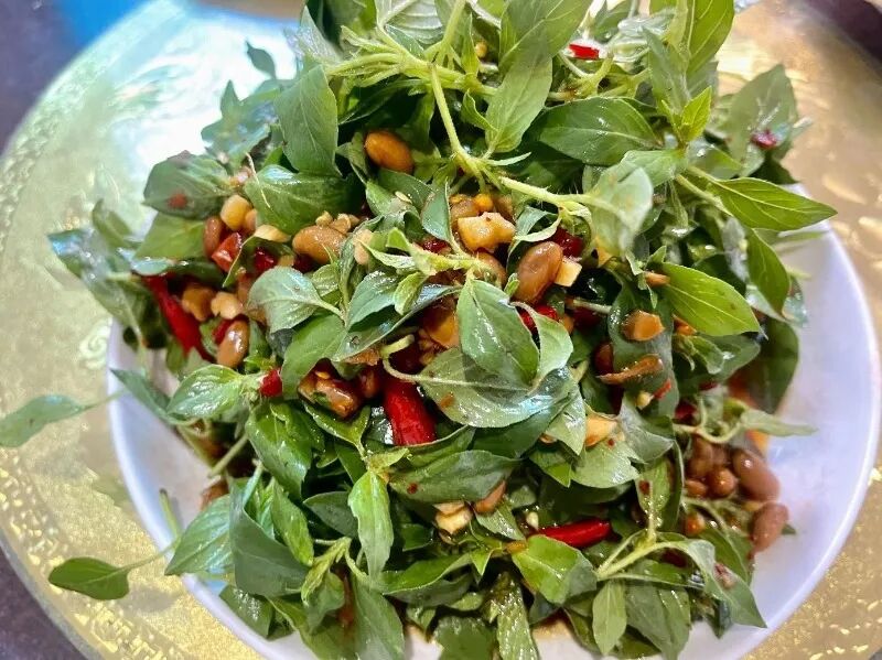 “转转香”是罗勒的嫩叶,罗勒是药食两用的芳香植物,有疏风行气,化湿消食、活血、解毒之功能。罗勒气味似松香,口味香甜回甘,在比萨、意大利面和通心粉等西餐里是常用调料,在中餐里不常见,在永仁是一道朴素但风味十足,令人印象深刻的特色美食。