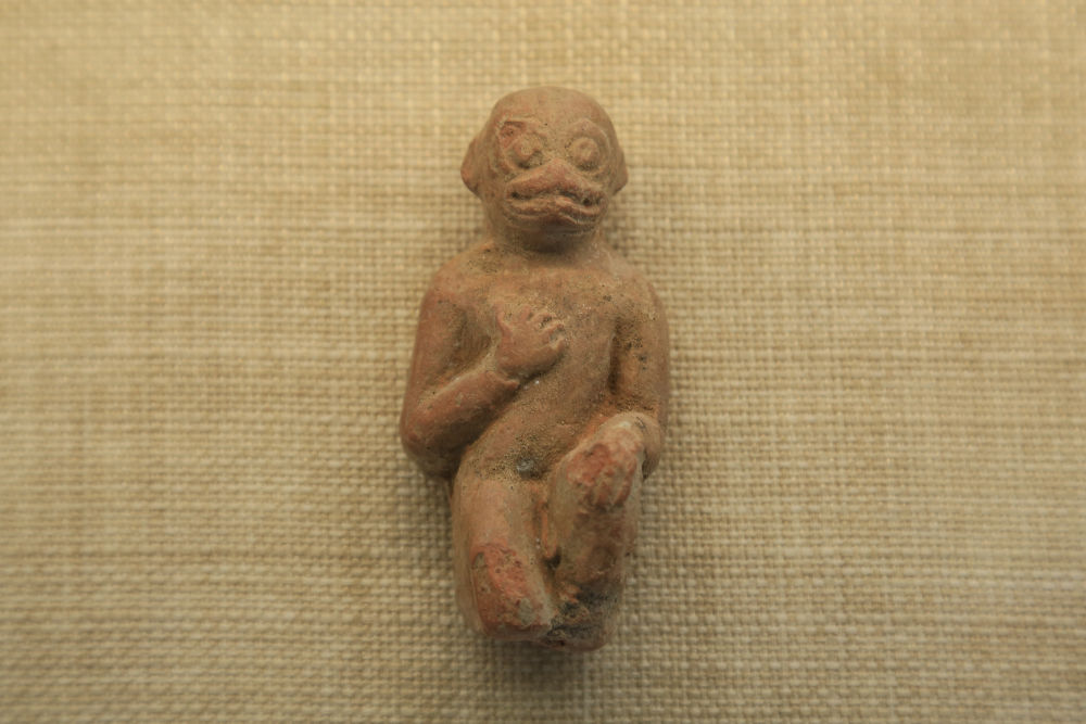 托库孜萨来(唐王城)遗址发掘出土并展出的红陶猴形佛像。(贺浩摄)