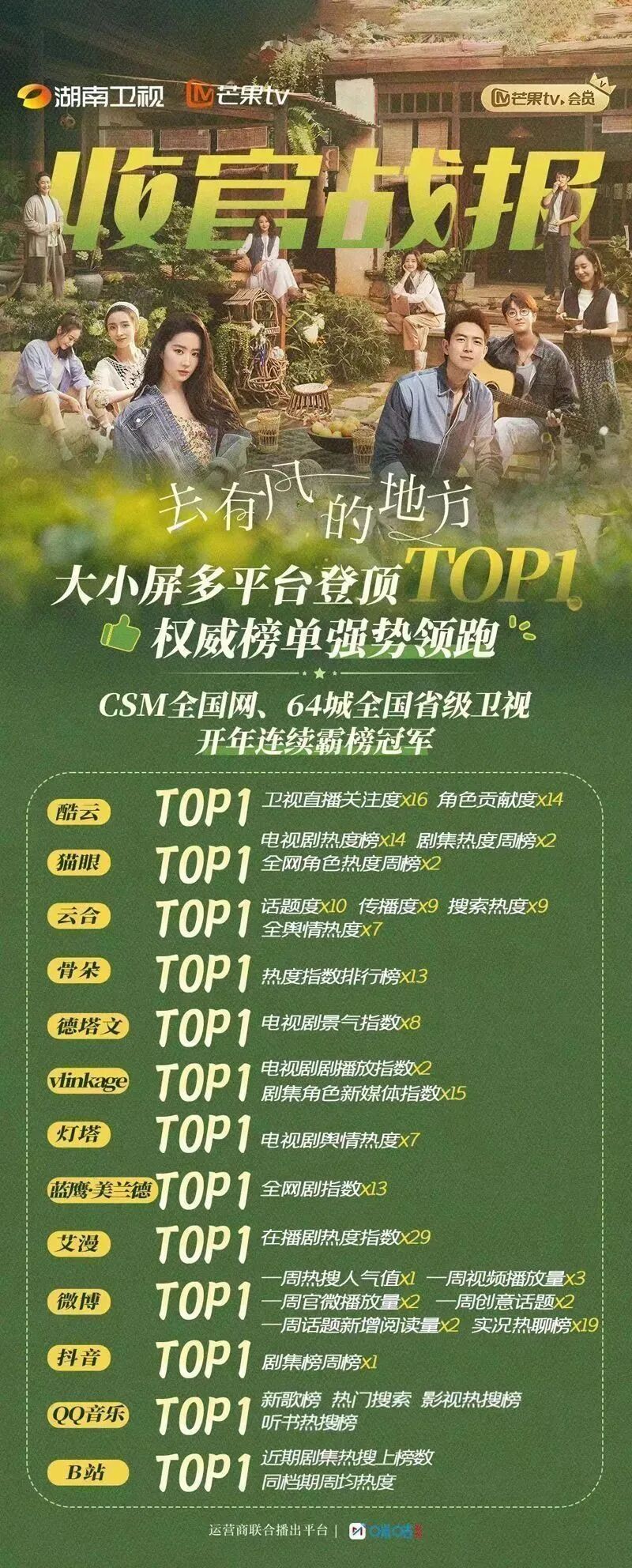 2023年1月3日,《去有风的地方》在湖南卫视和芒果TV双平台首播。播出后,该剧创造了全网卫视收视榜冠军和猫眼剧集实时热度总榜冠军,并在各个社交平台引发热议。