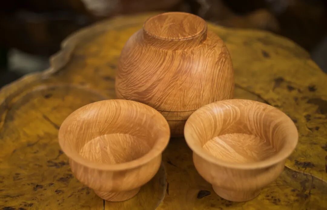 杜鹃根、杂本根、核桃木、柳木等都是用于制作木碗的原材料。木碗手作艺人在用料和制作工艺方面,用他们的智慧让木碗能够供人们长期使用。