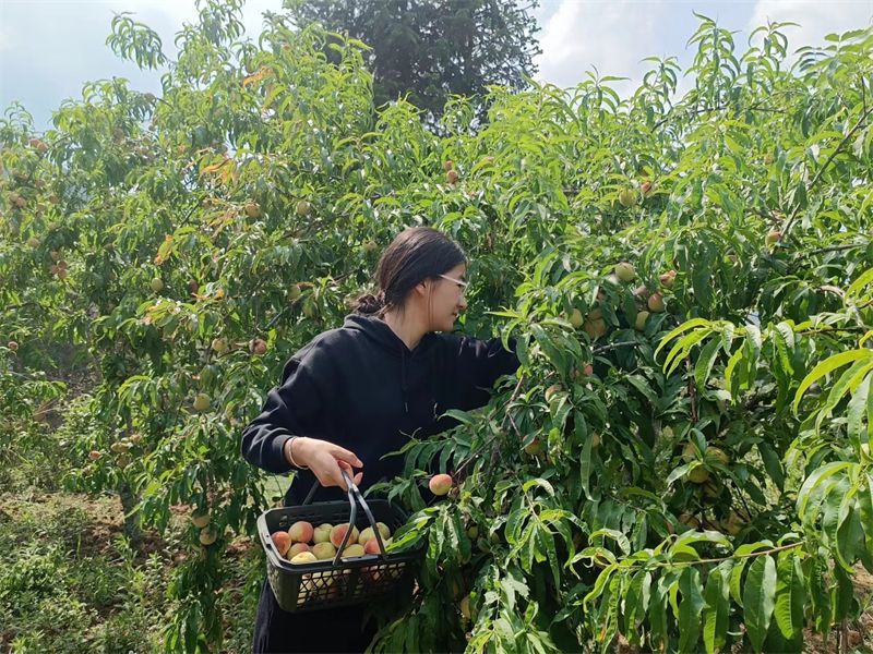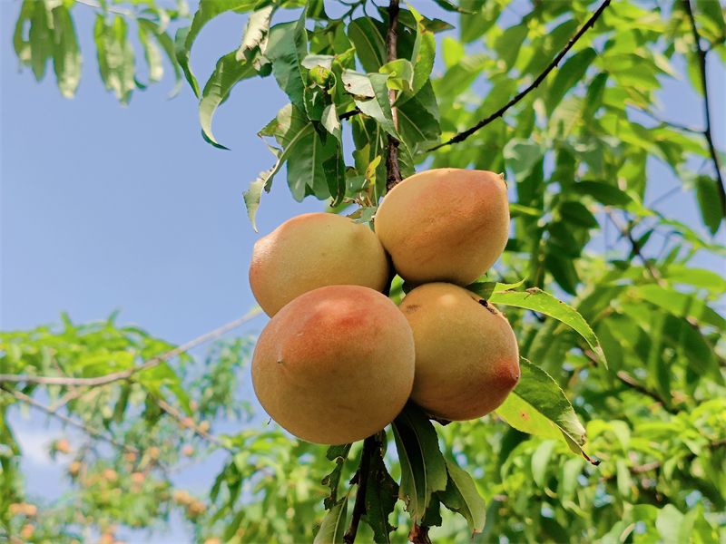 走进桃园,味美多汁的桃子在青翠桃叶映衬下鲜嫩饱满,似一个个小灯笼挂满树梢,一阵微风拂过,泛着红晕的桃子随风摇曳,桃园果香扑鼻,引人垂涎欲滴。