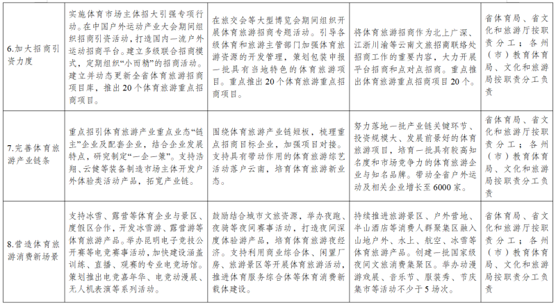 8、加大招商引资力度。搭建招商引资平台,每年组织体育旅游主题招商活动,聚焦省外体育旅游领域龙头企业、链主企业实施精准招商。建立全省体育旅游招商项目库,每年推出不少于20个体育旅游重点招商项目。引导各级体育、文化和旅游部门加强对当地体育旅游资源的开发与管理,包装策划一批具有当地特色的体育旅游项目,建立省、州(市)、县(市、区)、企业等多级联合招商模式,推动重点项目签约落地。