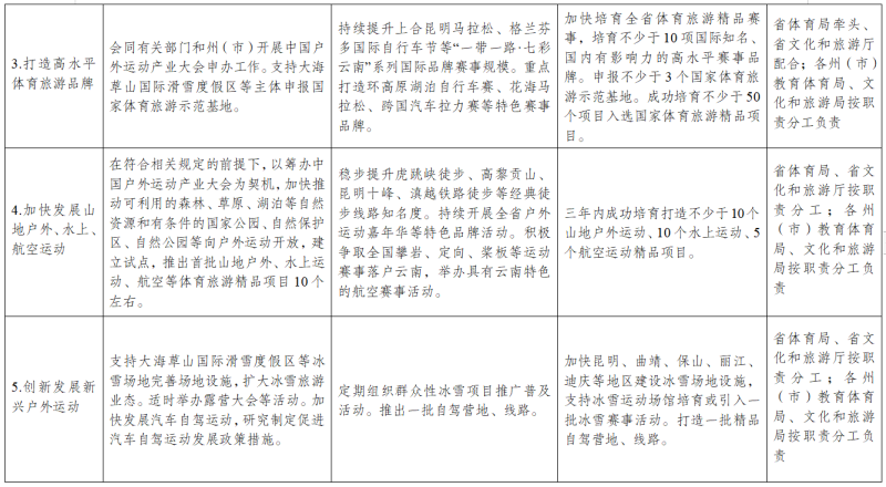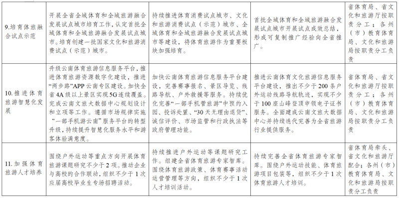 ——构建特色体育旅游产品体系。围绕全省丰富的体育、旅游资源禀赋及产业优势,着力打造出具有云南特色的体育旅游产品体系,促进体育产业同旅游产业融合更加紧密,力争到2025年,全省共培育不少于100个体育旅游精品项目。