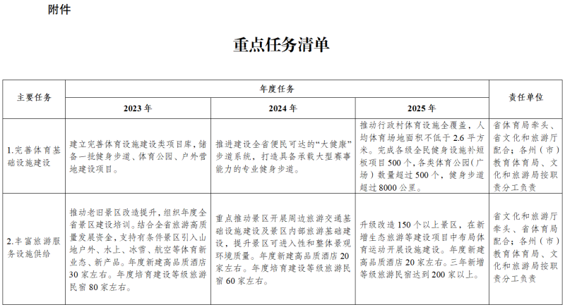 ——充分释放体育旅游消费潜力。围绕不同人群、不同场景开发多元化、多层次体育旅游消费市场,提升体育和旅游消费水平,推动旅游业从“门票经济”、“观光经济”向“综合消费经济”转变,力争到2025年,全省参与体育旅游总人数约占旅游总人数的5%。