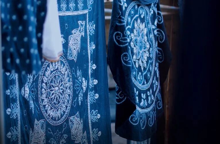 白族扎染全靠手工制作,多以蓝白为主色,白色代表吉祥如意,青色则代表希望、纯朴和真挚,青白结合表示“清清白白,光明磊落”,如同一段干净纯洁的爱,不染尘埃。