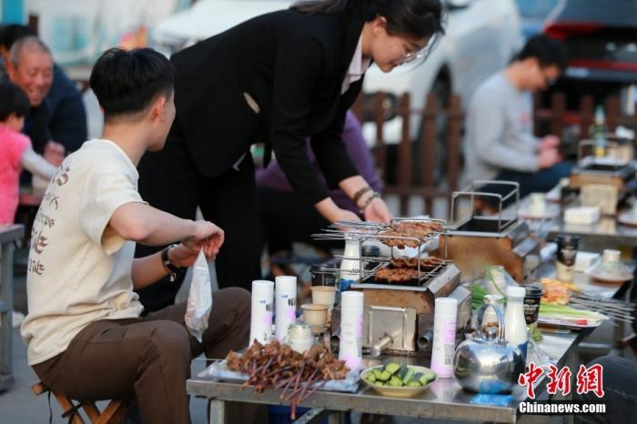 资料图:山东淄博,食客正在享用烧烤。 中新社记者 梁犇 摄