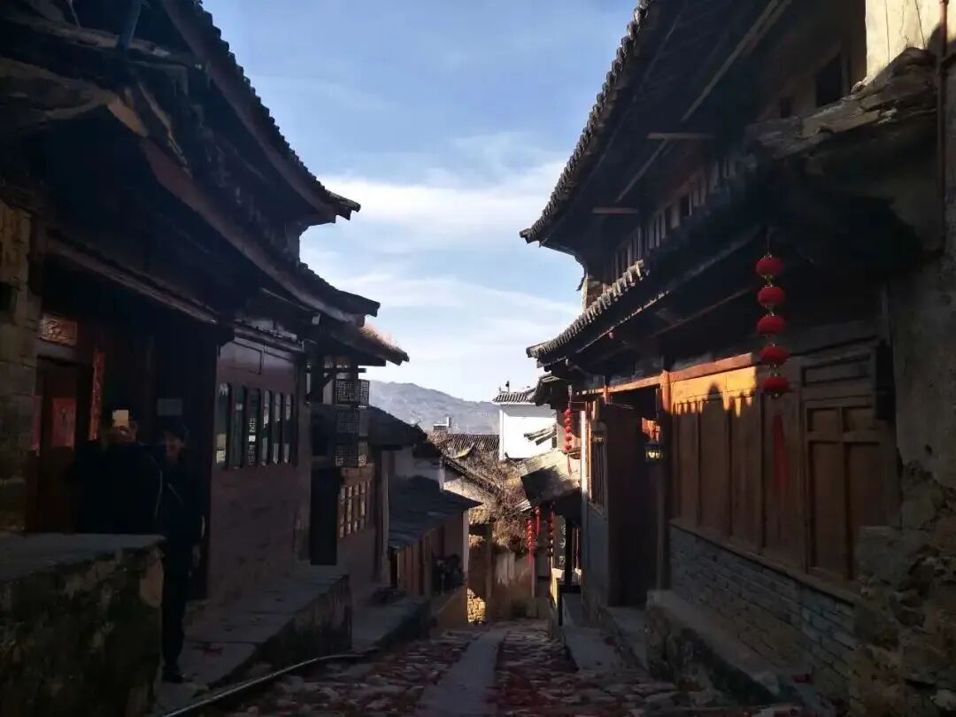 街面两侧带有江浙风格和大理白族南诏特色的民居建筑错落有致,层层递升,纸糊的灯笼和掀窗木柜台虽已鲜见,但一幢幢百年老屋依旧释放出它的慈祥和温馨。仅剩断壁残垣的川黔会馆和一块大理会馆匾额的楼梯街,当年商旅云集的繁华景象,依然可在这支离破碎的残留中显现。街边檐下弃置着一尊尊形似马鞍的碾压石和一台台布满蛛丝灰尘的手摇纺车,是历史上的鲁史纺织印染等手工业繁华的见证。