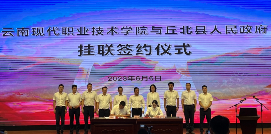 为贯彻落实《云南省教育高质量发展三年行动计划(2023——2025)》,开展好“校地结对帮扶”工作,在前期相互对接、充分调研的基础上,6月6日上午,云南现代职业技术学院与文山州丘北县人民政府“校地结对帮扶”协议签约仪式在丘北县民族职业高级中学举行。