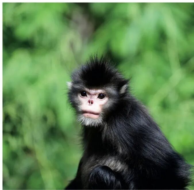 我们的毛发配色和国宝大熊猫相似,通体黑色,耳朵、脸颊有少量的白毛,白色的耳羽尤为明显,所以我们大概率也拍不了彩色照。而最具特征的就是我们丰满性感的嘴唇和上翘的鼻子,但也正因为这朝天鼻,也成了我们的负担,因为下雨的时候雨水就会流进鼻孔,让我们忍不住打喷嚏。所以下雨的时候如果遇到我们,就会看到我们排排坐地把头埋在两膝之间,场面多少有点搞笑。