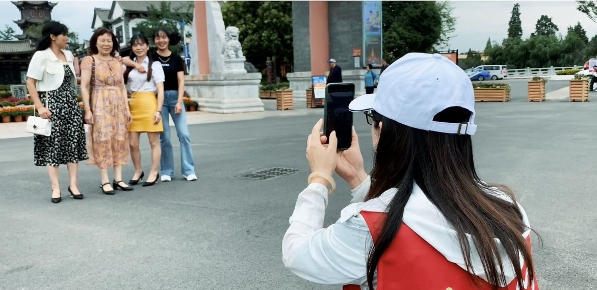 游客中心门口,几名身着“红背心”的人们不停地忙碌着。“红背心”们有的为游客指路,有的热情地为游客介绍景区,有的招呼游客排成一排,在“笑一下”的提醒声中为游客不停地按动手机,留下游云南的美好瞬间。来自四川自贡和绵阳的游客高兴地与身旁的“红背心”热情拉起了家常,称道云南的旅游服务。入园检票口,两名“红背心”和景区工作人员一边检票,一边轻声提醒游客注意安全,游客点头致谢。