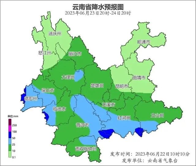 6月23日20时到6月24日20时普洱市东部、西双版纳州东部、玉溪市南部、红河州南部、文山州南部、保山市南部、德宏州、临沧市西部阴有中到大雨局部暴雨,其他地区阴有小到中雨局部大雨。