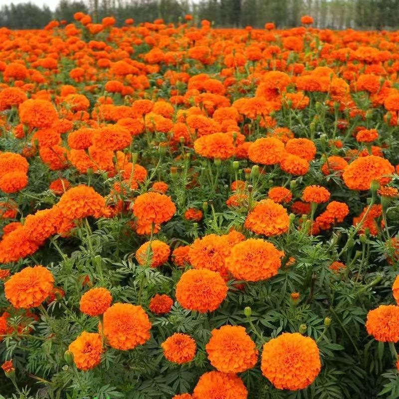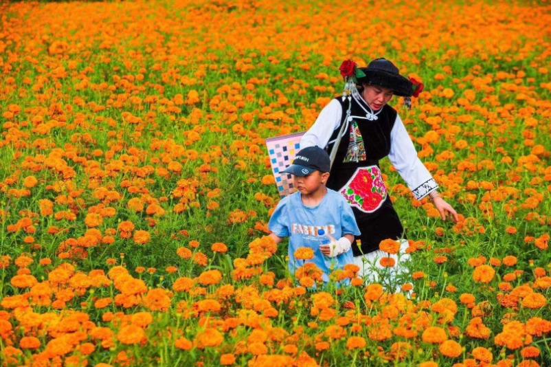 一片片金黄的万寿菊镶嵌在山野田间,花海散发的魅力,让你流连忘返。