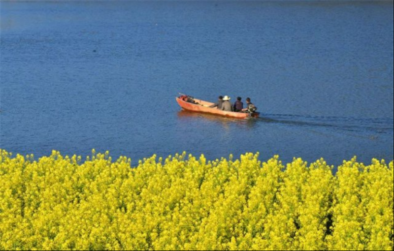 泛舟耐桥水库,伴着清风,感受一抹明黄与湛蓝的“激情碰撞”。