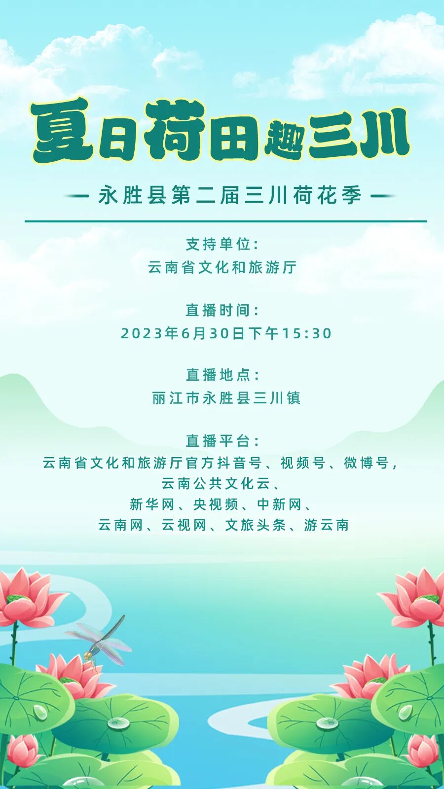 6月30日15:30,丽江市永胜县将举办第二届三川荷花季开幕式活动,届时将开启“夏日荷田趣三川”直播活动。