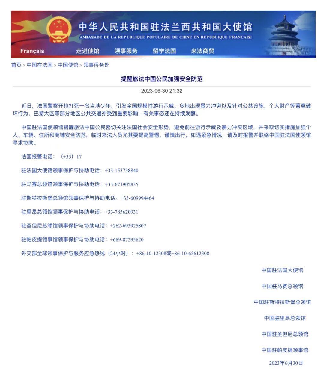 6月30日,中国驻法国使领馆发布安全提醒,提醒旅法中国公民密切关注法国社会安全形势,避免前往游行示威及暴力冲突区域,并采取切实措施加强个人、车辆、住所和商铺安全防范,临时来法人员尤其要提高警惕,谨慎出行。如遇紧急情况,请及时报警并联络中国驻法国使领馆寻求协助。