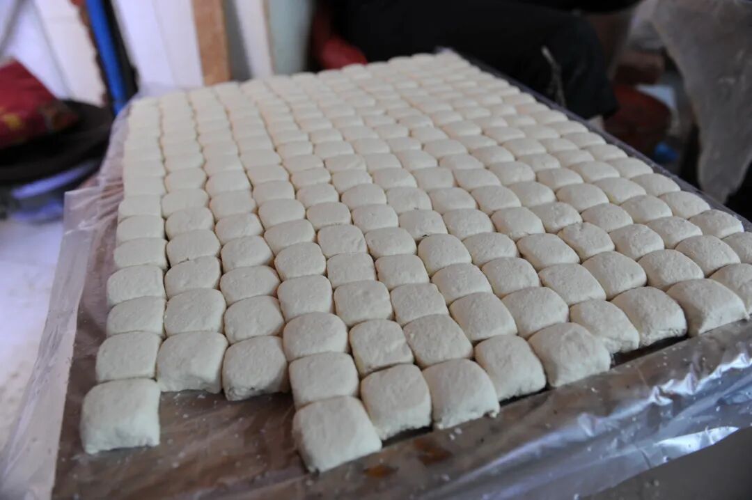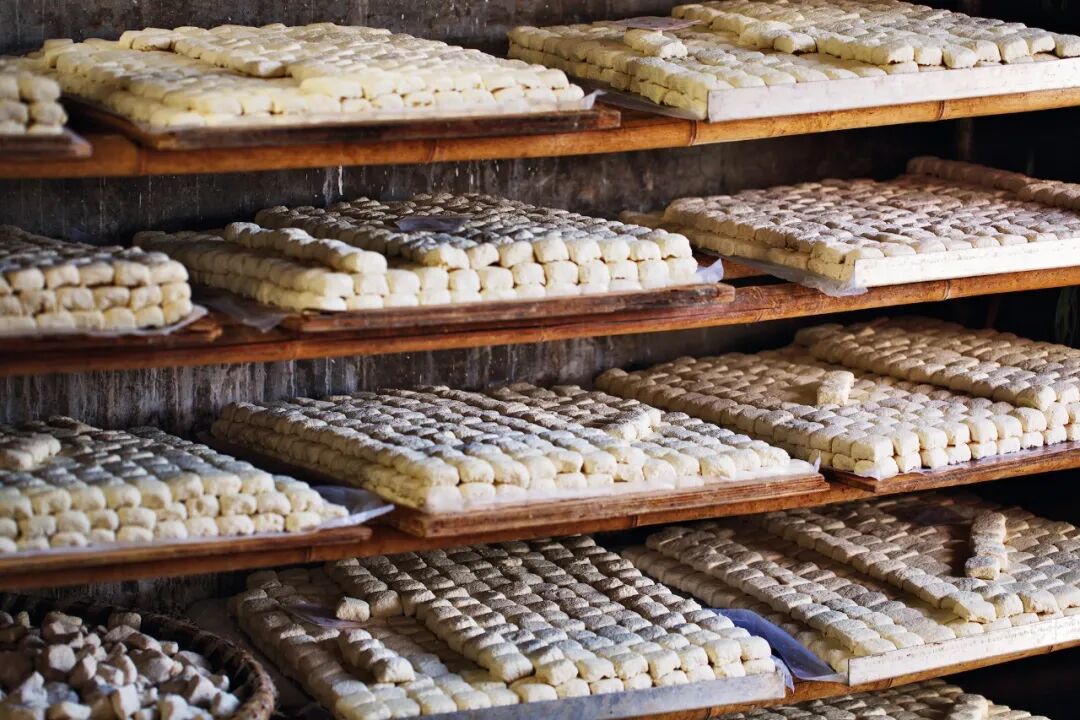 历经时代的变迁和岁月的磨砺,西门豆腐演变为“选豆—粉碎—筛豆皮—泡豆瓣—磨浆—生浆稀释—分浆—煮浆—点豆腐—包豆腐—压豆腐—晒豆腐”12道传统工序。值得一提的是,西门豆腐在熬制过程中不提取豆腐皮,完全保留了大豆的营养成分,尤其是充足的大豆油脂等成分。其独特的包制也是中国豆腐制作中的绝技,豆腐起锅后浸泡在滚热的豆浆之中,趁热用4×4公分纱布,将豆腐包成小块。