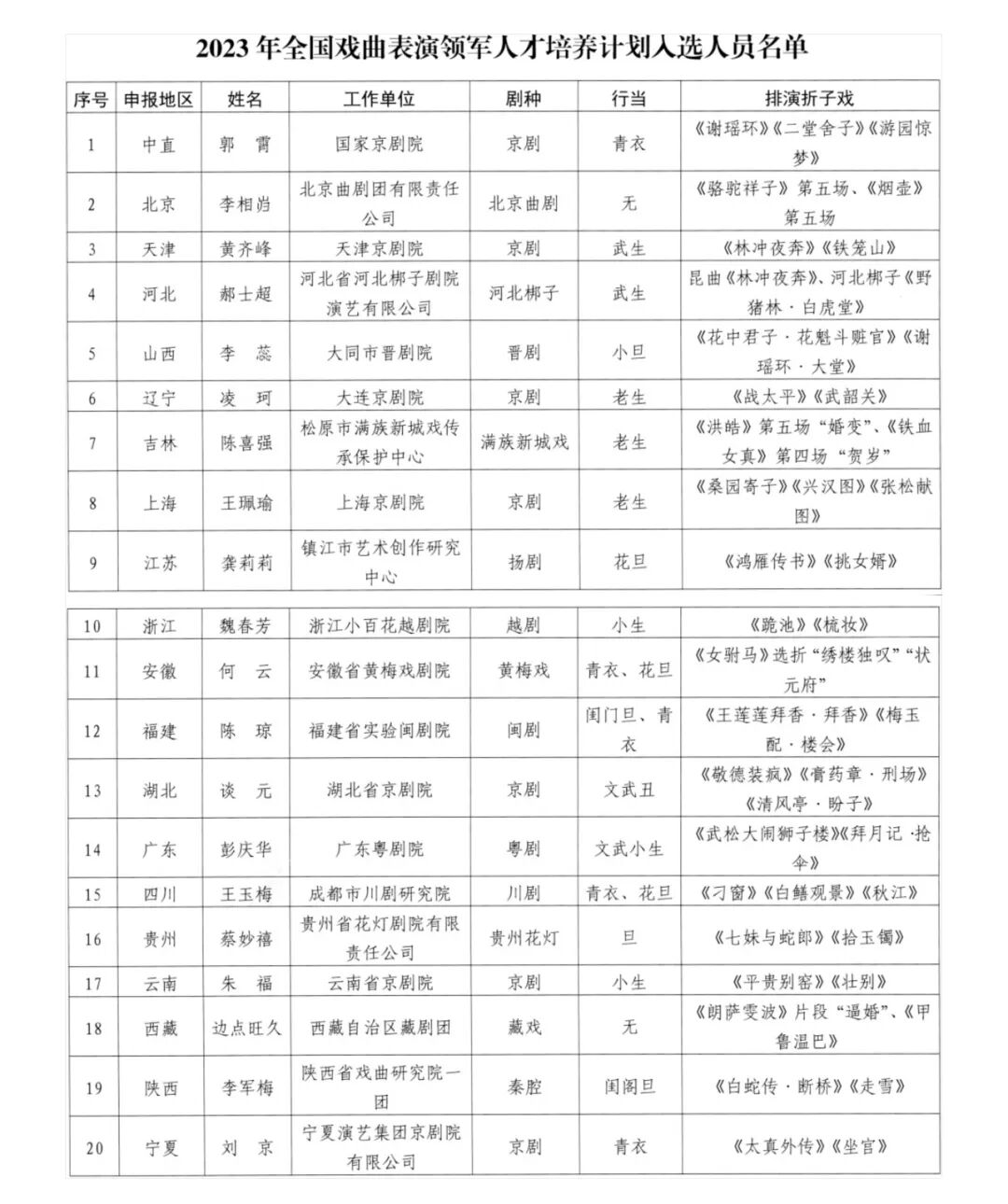 2023年全国戏曲表演领军人才培养计划的遴选工作已经顺利完成,共有20人入选。现将名单予以公布。(来源:文旅之声)