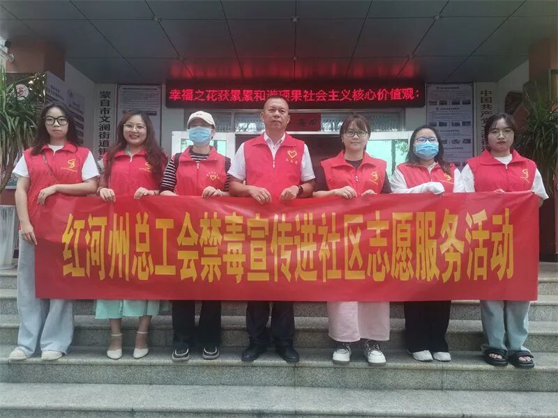 红河州总工会开展禁毒宣传进社区志愿服务活动。活动现场,志愿者通过悬挂横幅、发放宣传资料等多种形式,向过往群众讲解毒品的种类、危害及如何抵制毒品等相关知识,使群众清晰深刻地了解到毒品给个人、家庭和社会带来的危害,同时号召邻里乡亲一起行动起来,坚决抵制毒品危害,共建平安美好家园。