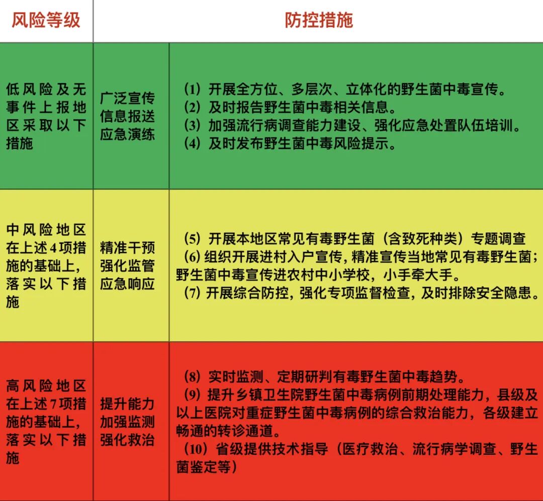 全省共划定有毒野生菌中毒风险高风险地区7个(宜良县、红塔区、华宁县、新平县、澜沧县、墨江县、砚山县),中风险地区51个,低风险地区62个,无上报地区9个。对不同风险等级地区,从宣传发动、信息报送、加强监测、精准干预、强化监管、应急响应、强化救治等方面,分级分层、针对性制定2023年全省有毒野生菌中毒风险防控措施。
