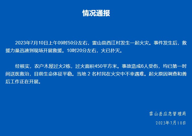 央视网消息:据“悠然雷山”微信公众号消息,雷山县应急管理局通报,7月10日上午09时50分左右,雷山县西江村发生一起火灾。事件发生后,救援力量迅速到现场开展救援。10时20分左右,火已扑灭。