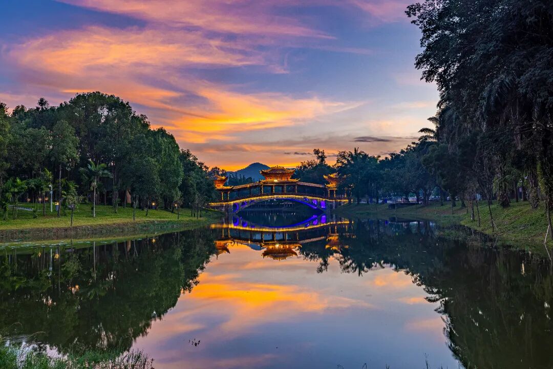 漫步拉祜风情园,湖水、拱桥、回廊,错落有致。到了夜晚,璀璨的灯光将木质雕花拱桥装饰得金碧辉煌,也让钢索吊桥变得浪漫十足,而用灯管装饰的“琉璃树”更是成为网红打卡点。游玩累了,还可以到茶叶展示中心小憩,品一杯普洱香茗,享受一段悠然时光。