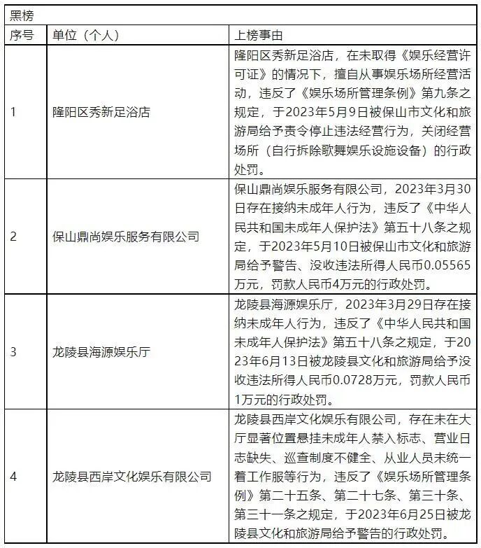 为认真贯彻落实《云南省人民政府关于印发云南省旅游市场秩序整治工作措施的通知》(云政发〔2017〕19号)精神,根据《保山市文化和旅游“红黑榜”制度》,决定将诚信守法的涉文、涉旅企业和有关从业人员纳入红榜,予以通报表扬;将违反文化、旅游相关法律法规,受到行政处罚的涉文、涉旅企业和有关从业人员纳入黑榜,予以通报警戒。现将名单通告如下,接受社会监督。