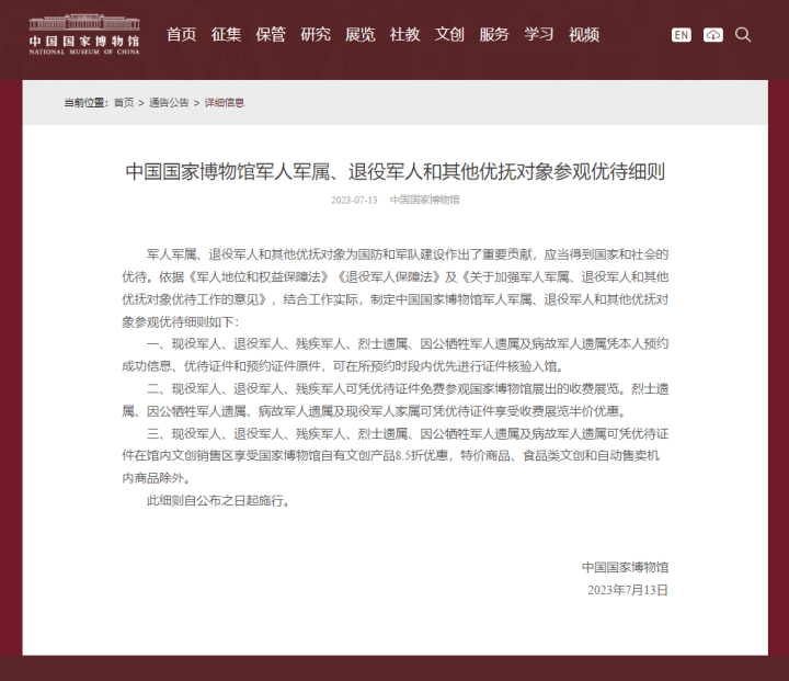 7月13日,国家博物馆发布《中国国家博物馆军人军属、退役军人和其他优抚对象参观优待细则》,全文如下: