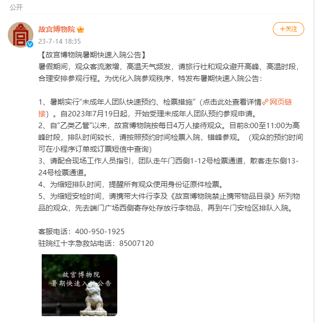 @故宫博物院14号发布公告称,故宫在暑期实行“未成年人团队快速预约、检票措施”,自2023年7月19日起,开始受理未成年人团队预约参观申请。公告全文如下——